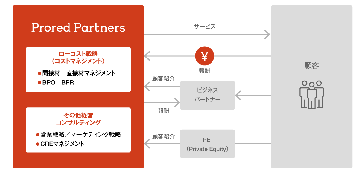 顧客の購買機能の一部もしくは全てを当社にて請け負い、発注業務の集約、サプライヤー選定、毎月のPL作成を行い、追加で更なるコスト削減の実施と業務改善(BPR)を提供 |