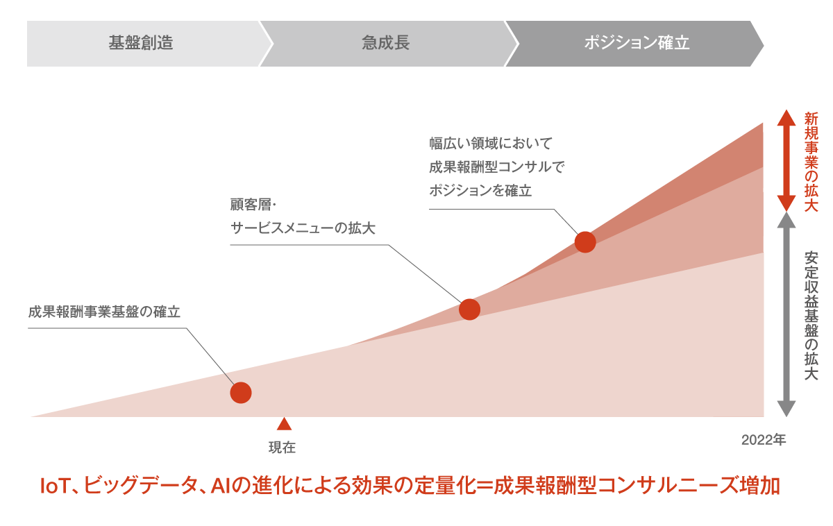 また、IoTデバイスやビッグデータの進化により、「あらゆる状況が定量化」されることに加え、「あらゆるデータが蓄積」され、「成果の定量化」が可能になることで、コンサルティング業界でも「成果報酬型」のニーズは益々高まっていくと考えています。